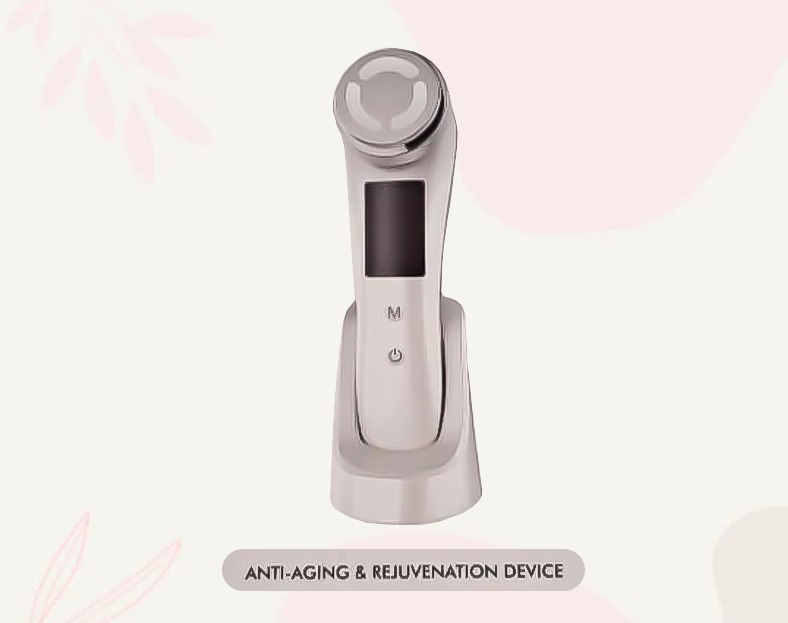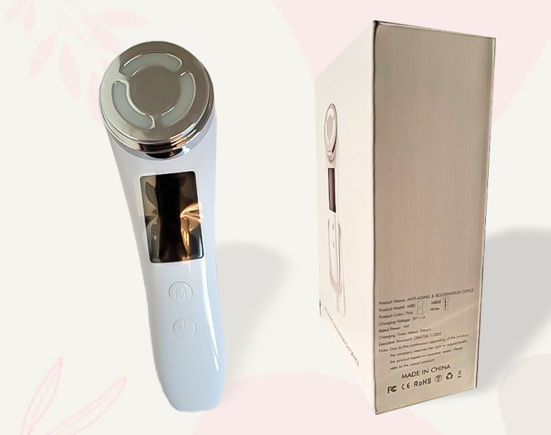 Handheld Rejuvenation device delivers EMS micro current (Galvonic ions)with red, green and blue light to improve skin signs of hypepigmentation, acne, fine lines and wrinkles.